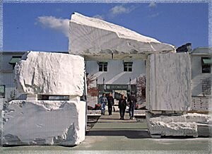 Vermont Routes The entrance to the exhibit is guarded by a large archway made of giant marble blocks - again, hard to miss. It looks suspiciously like the entrance to the town of Bedrock, and I found myself humming the theme song to the Flintstones as I walked underneath. Inside, the exhibit is much more stately. In the main entry hall are polished panels of Vermont marble, from Verde Antique - a stunning green stone - to Champlain Black - a black marble that still contains fossils -to Imperial Danby - the bright white marble that Vermont is famous for. The film is probably the most informative part of the exhibit. Continuously running this 11-minute movie covers the history of the Vermont Marble Co. It even proudly mentions how Colonel Redfield Proctor, founder of the Vermont Marble Co. an ambitious politician, used his leverage as a U.S. Senator to ensure several structures, like the U.S. Supreme Court Building and Jefferson Memorial, were constructed of Vermont marble. Although Proctor had handed over control of the company to his son by the time he went to Washington, conflict of interest was clearly not an issue in 19th century politics. Other interesting exhibits are the Geology Room with its "Living Earth" exhibit and the Geological/Historical Room with its pictures of early quarrying methods. Displays also help the non-geologically oriented distinguish a white marble from a green marble from a far-off cousin, granite. But my favorite exhibit is the Marbles of the World located at the far end of the building. The entire room is lined with gigantic panels of marbles from all corners of the earth - from the powder-puff Champion Pink found in Tennessee to the almost biological-looking terracotta-colored Ramello Rosso from Italy. The whole room reminded me of the palaces in Europe where marble and other ornate stone was used like wallpaper. From there, the exhibit spills you out in the gift shop full of marble lamps, cutting boards and the like.